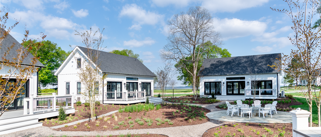 Our Reed, Grove, Emory, and Pearl Bungalows – named for local Chesapeake Bay Watershed creeks – each feature two bedrooms with queen beds, two full baths, a living area, and a kitchenette. Set in a private courtyard with golf course views and woodland surroundings, plus peaceful glimpses of the water, they offer a tranquil retreat on Maryland’s Eastern Shore. Guests also enjoy access to a shared propane grill and firepit.