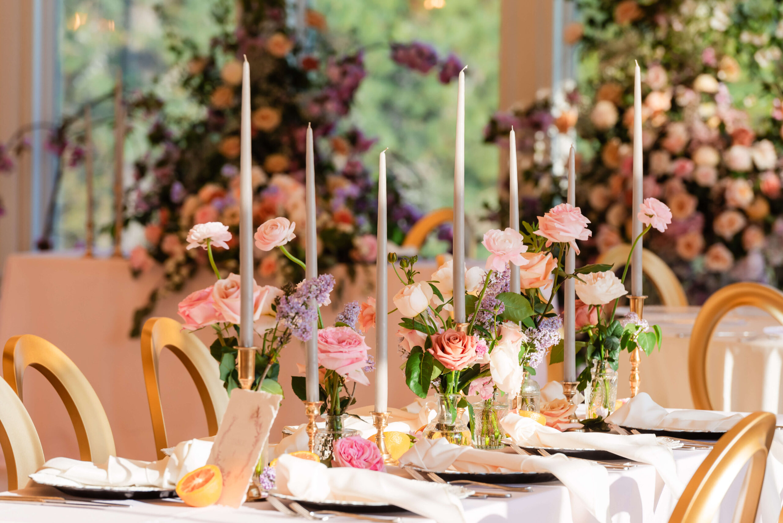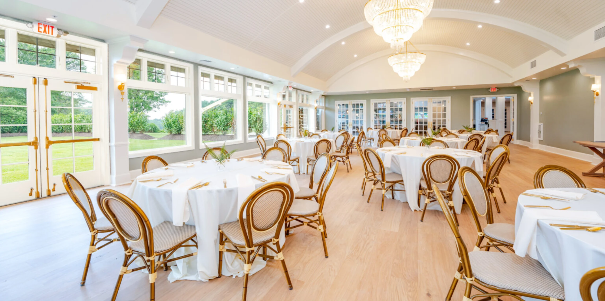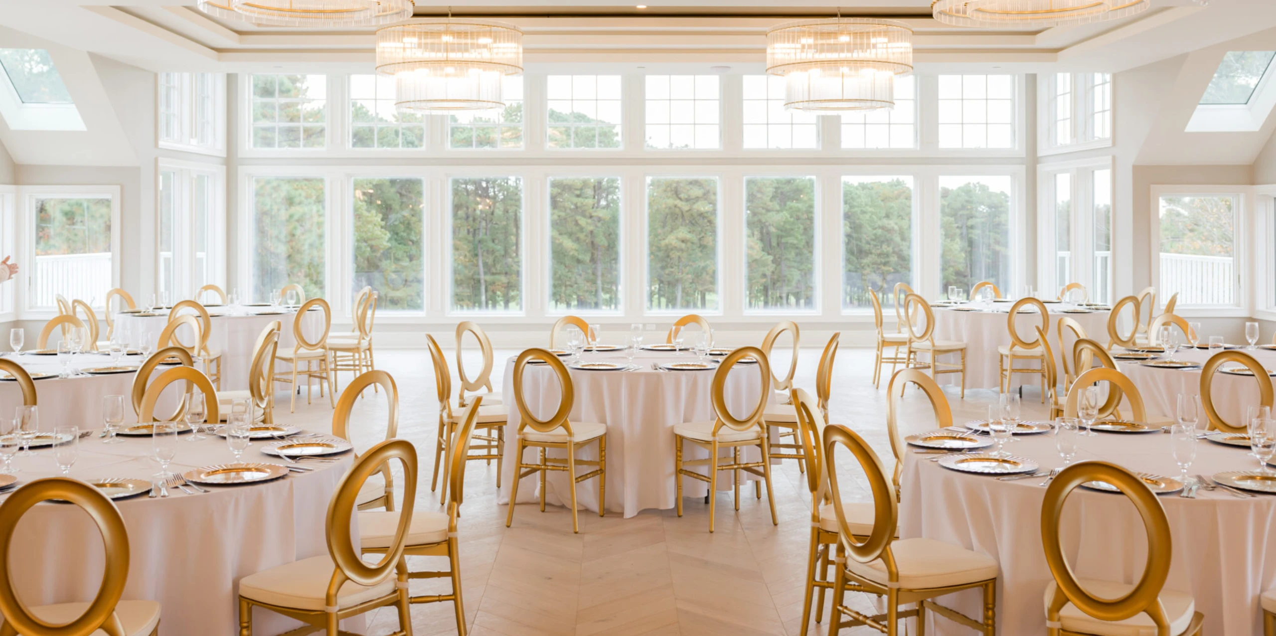 Our whimsical Garden Ballroom creates a light and airy atmosphere with picturesque views. With grand crystal chandeliers boasting from vaulted ceilings and glass window features, this event space is ideal for any occasion.